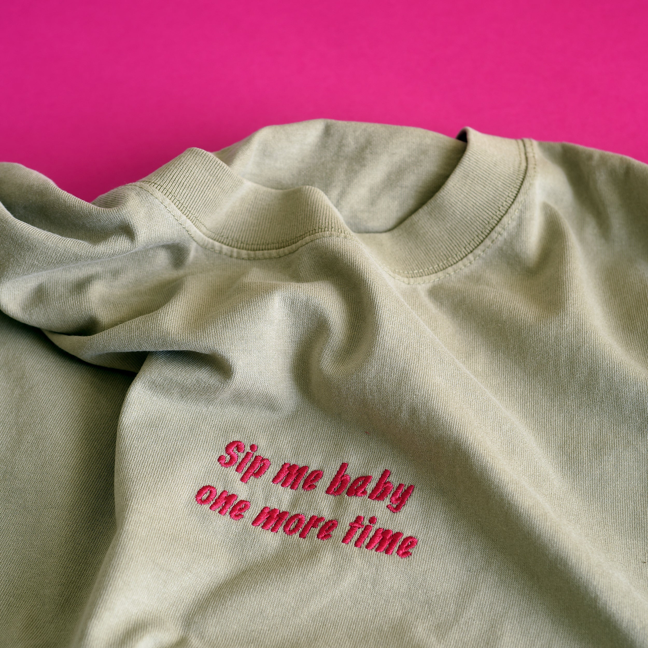 Pale Khaki Green with hot pink embroidery font and sublime branded on sleeve